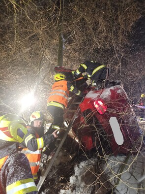 Am 10. Januar wurden wir um 22:59 Uhr zu einem schweren Verkehrsunfall mit eingeschlossener Person alarmiert. Ein Personenkraftwagen mit insgesamt fünf Insassen war von Bachmanning in Richtung Eisgering unterwegs. In einer Kurve kam das Fahrzeug aufgrund winterlicher Fahrverhältnisse von der Fahrbahn ab, rutschte eine Böschung hinunter, prallte gegen einen Baum und kam schließlich in Seitenlage zum Stillstand.